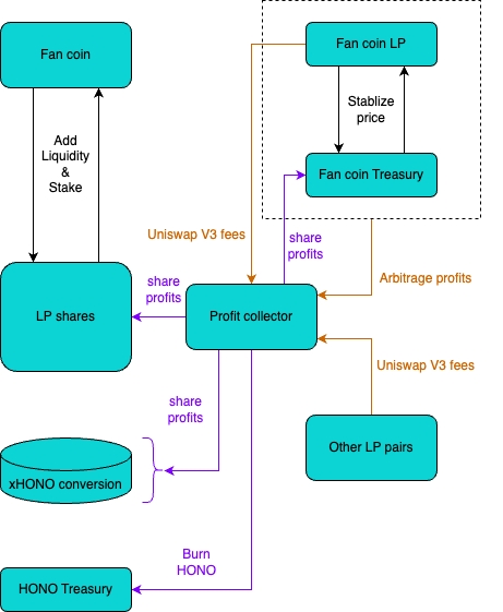 Fan coins are rebased tokens backed by HONO. This means that the value of fan coins will grow in multipliers of HONO growth rate as more HONO goes into backing the fan coins.